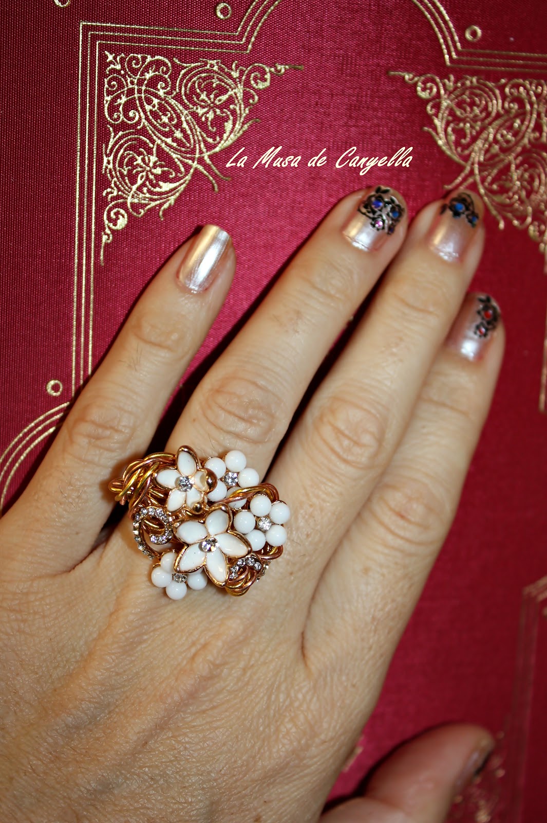 EXCLUSIVO, ORIGINAL, DELICADO, GLAMOUROSO, SEXY ATRACTIVO Y EXTREMADAMENTE DIVINO. Anillo de edición limitada. Hecho a mano y combinado en dos tonos de aluminio, oro y bronce, engalanado con esta sutil pieza de flores esmaltadas en blanco roto. Haz que tu joyero brille con piezas selectas y únicas como esta.